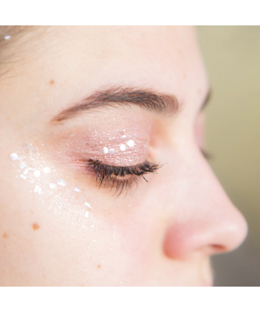 Appliquez une petite touche de beurre de karité puis disposez les paillettes sur vos paupières, pommettes, sourcils ou autre partie du corps pour un moment festif.