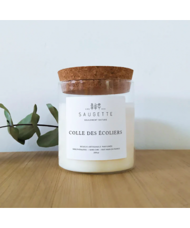Retrouvez un doux parfum d'enfance avec la bougie colle des écoliers, un rappel immédiat au petit pot de colle blanche.