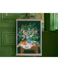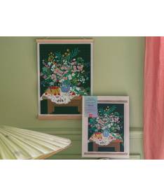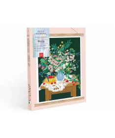 Le kit contient : 1 toile en coton adhésif imprimée format 30x40 cm ; 1 stylet à diamanter et ses 5 embouts ; des sachets de diamants, plaques de colle, 2 baguettes en bois naturel, 1 notice avec un descriptif des conseils et une interview de l'illustrateur/trice.