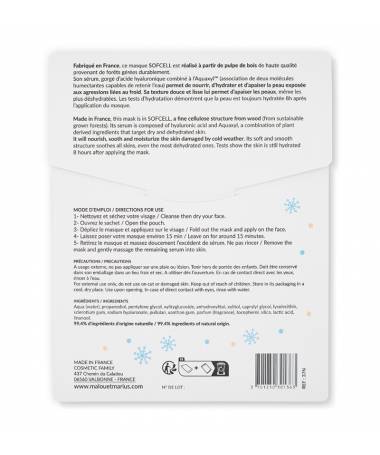 Sérum gorgé d'acide hyaluronique combiné à l'Aquaxyl (association de deux molécules humectantes capable de retenir l'eau) est idéale pour nourrir et apaiser les peaux sèches et sensibilisées par le froid. Ce masque agit comme un bain d'hydratation.