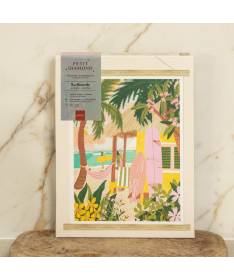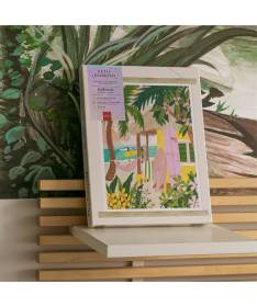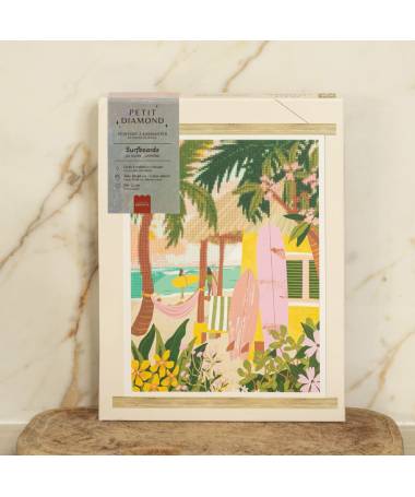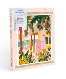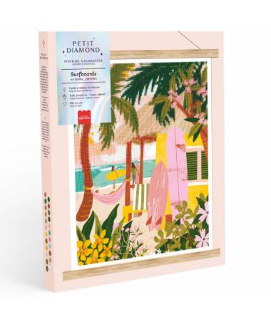 Le kit contient : 1 toile en coton adhésif imprimée format 30x40 cm ; 1 stylet à diamanter et ses 5 embouts ; des sachets de diamants, plaques de colle, 2 baguettes en bois naturel, 1 notice avec un descriptif des conseils et une interview de l'illustrateur/trice.